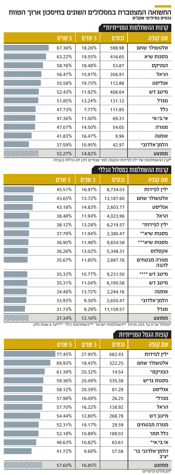 בולטים לרעה גם המסלולים של מגדל, כלל, אי.בי.אי ומנורה, עם תשואות מצטברות מתחת לממוצע בחמש השנים האחרונות. במסלולים הכלליים הגדולים, שם נמצא רוב הציבור, ילין לפידות ואלטשולר שחם מובילות גם כן (מקומות ראשון ושני בהתאמה) לצד אנליסט שבמקום השלישי. ההובלה של גופים אלה בניהול החשיפה המנייתית דחפה גם את המסלולים הכלליים שלהם לביצועים מובילים, זאת לצד העובדה שהם השכילו לנהל גם את החשיפות שלהם לני"ע אחרים כמו אג"ח קונצרניות וממשלתיות. לעומת זאת, פסגות, שהמסלול המנייתי שלו היה מצטיין, מציג תשואות ממוצעות בלבד במסלול הכללי.
