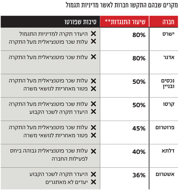 אולם, לא כל החברות ממהרות לעקוף את בעלי המניות. לראיה, חלק מן החברות שדגמנו העדיפו לבצע תיקונים - אפילו חוזרים ונשנים - ולקבוע אסיפות חוזרות. אולם חברה אחת, או.אר.טי, בחרה לאשר את מדיניות התגמול על אפם ועל חמתם של הגופים המוסדיים.