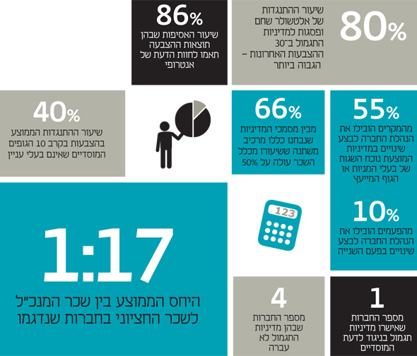 שווי השוק הממוצע של 45 החברות במדגם עומד על 1.2 מיליארד שקל. השכר המקסימלי הממוצע שאושר (למעט תגמול הוני) עומד על 3.4 מיליון שקל. ב־40% מהחברות השכר המקסימלי עובר את תקרת 3.5 מיליון השקלים שמתיר החוק. זהו עיוות שיצר החוק כלפי המוסדות הפיננסיים: בכ־65% מהחברות מרכיב התגמול המשתנה מהווה 50% ויותר מכלל התגמול השנתי. כלומר, החברות מקפידות לקשור את ביצועיהן לתגמול המנכ"ל. לעניין המינון וטיב המדדים הכמותיים שהן קובעות כקריטריון אפקטיבי לתגמול - זה כבר סיפור אחר, שנתון למדיניות ולבחינת הגופים עצמם.