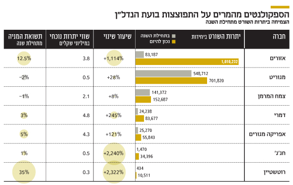 כך, למשל, יתרות השורט על מניית חברת אזורים, שמנוהלת על ידי דרור נגל ונחשבת לאחת מחברות המגורים הגדולות בישראל, רשמו זינוק של יותר מפי 12 בתוך חודשיים בלבד.