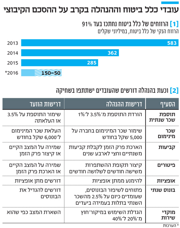 לאחר שרווחיות כלל ביטוח נשחקה בעשרות אחוזים, החברה רוצה לקצץ בתנאי העובדים בהסכם הקיבוצי החדש. אתמול פתחו העובדים בצעדי מחאה, כשזירות הקרב העיקריות הן העלאת שכר המינימום ושמירה על תוספות השכר