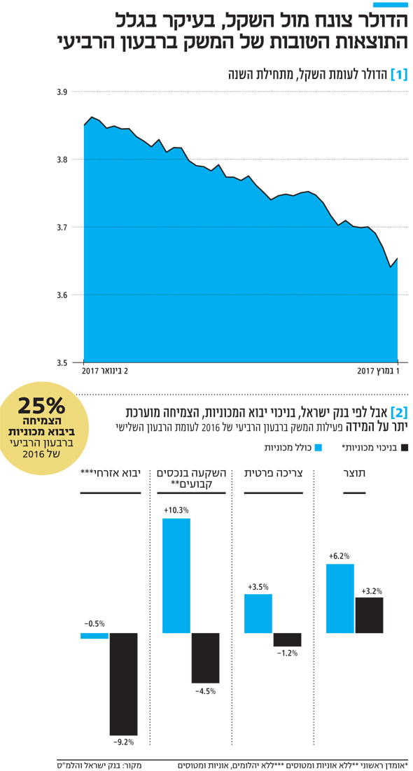 כדי להבין מדוע בנק ישראל מרגיש שמדובר בהתלהבות גדולה מדי מצד פעילים זרים ומקומיים, אפשר להסתכל על חישוב ראשוני שערכה חטיבת המחקר בבנק. לפי האומדן, בניכוי הגידול האדיר ביבוא מכוניות ברבעון הרביעי של השנה שעברה (עלייה של 25%) התוצר עלה ב־3.2% בלבד, הרבה יותר קרוב למגמה ארוכת הטווח של המשק הישראלי. הצריכה הפרטית צונחת גם היא בניכוי יבוא המכוניות, ויורדת מ־3.5% למינוס 1.2%.