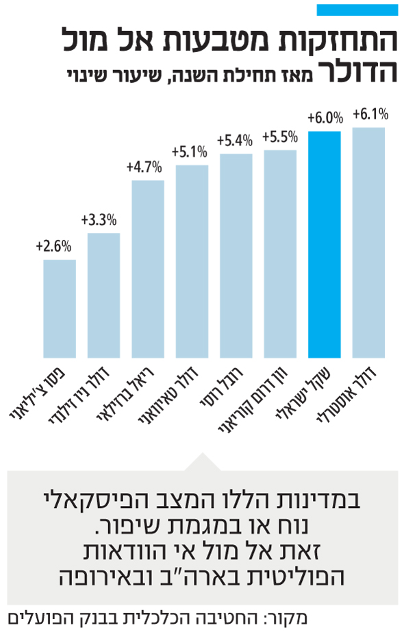 מבדיקה מיוחדת שערכו כלכלני מחלקת המחקר של בנק הפועלים עולה שהתשובה השנייה היא הנכונה. היועץ הכלכלי הראשי של הבנק, פרופ' ליאו ליידרמן, סיפר בשיחה עם "כלכליסט" כי "על רקע ההתחזקות החדה של השקל בתקופה האחרונה, בדקנו האם התופעה ייחודית לישראל. מהבדיקה עולה שתופעה דומה מאפיינת מטבעות נוספים בעולם. מתחילת השנה נרשם ייסוף ממוצע של כ־5% במדינות כמו אוסטרליה, קוריאה, רוסיה, טאיוואן וברזיל. ייסוף בשיעור מתון יותר נרשם בצ'ילה ובניו־זילנד".