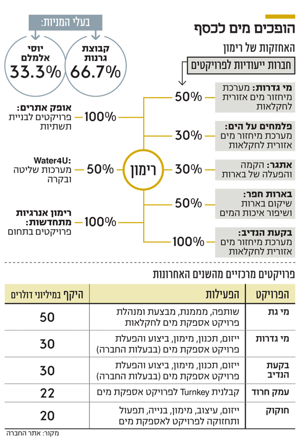 חברת תשתיות המים והגז מנהלת מגעים עם חתמים לקראת גיוס של 100–120 מיליון שקל לפיתוח עסקיה לתחומים נוספים. לפני שש שנים רכשו קבוצת גרנות ומייסד רימון יוסי אלמלם מניות בחברה לפי שווי של 85 מיליון שקל