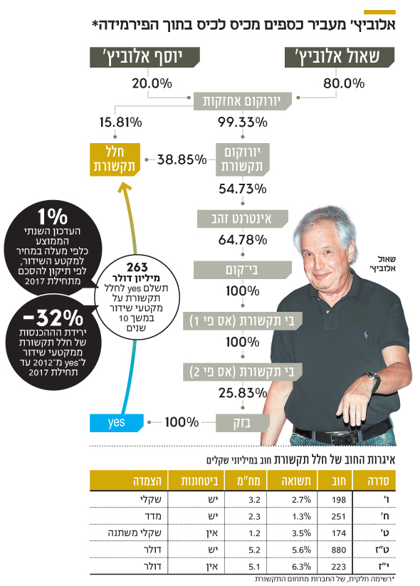 יד רוחצת יד. אלא שעולה החשש שמערכת היחסים בין שתי החברות שבשליטת שאול אלוביץ' היא לא בדיוק סימטרית. הביטוי המובהק לחשש הזה עולה מתיקון שהוכנס בתחילת 2017 להסכם קיים בין yes לבין חלל תקשורת. על פי ההסכם, yes מחויבת לרכוש בעשור הקרוב מקטעי שידור לוויין מחלל תקשורת בסכום מצטבר של 263 מיליון דולר. לכאורה, מבחינת שאול אלוביץ', בעל השליטה בשתי החברות, מדובר במשחק סכום אפס. הוצאה של חברה אחת (yes) היא הכנסה של החברה השנייה (חלל תקשורת). אלא שלא כך הם פני הדברים.