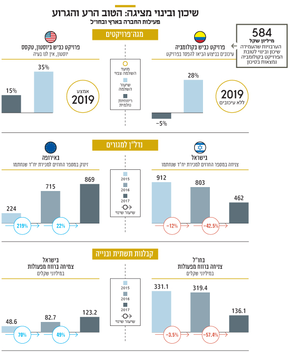 תוצאות הפעילויות של שיכון ובינוי בארץ ובחו"ל יוצרות תמונת ראי; לראשונה, מכירות הנדל"ן למגורים באירופה עקפו את המכירות בישראל; הבריחה מהבוץ באפריקה לאמריקה הולידה שני מגה־פרויקטים; אחד כושל בקולומביה ואחד מוצלח בטקסס; החדשות הרעות: נקודות החושך משמעותיות יותר מנקודות האור