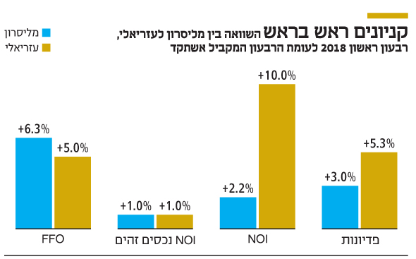 אם מנטרלים את התוספת של הנכסים החדשים, מליסרון הציגה צמיחה של 1% בלבד במהלך הרבעון, בדומה למתחרה שלה עזריאלי. בעקבות המשך החיסכון בעלויות מימון וחיסכון בהוצאות מיסוי, מליסרון הציגה עלייה בשורה התחתונה. ה־FFO המייצג של הקבוצה (התזרים מפעילות שוטפת ללא השפעת אירועים חד־פעמיים) עלה ברבעון בכ־6.3% לכ־170 מיליון שקל. צמיחה זו הושגה בעיקר על ידי גידול ב־NOI בסך כ־6 מיליון שקל. החברה סיימה את הרבעון הראשון לשנת 2018 עם גידול של כ־84% ברווח הבעלים לפני מס לכ־174 מיליון שקל.
