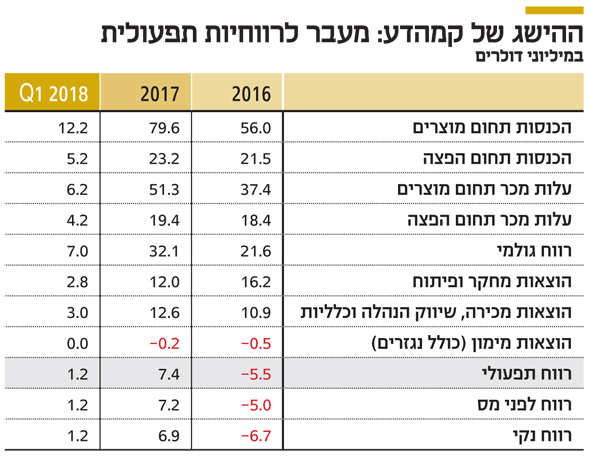 הרווח הגולמי של תחום המוצרים ב־2017 עמד על 28.3 מיליון דולר, רובו מיוחס ל־Glassia. תחום ההפצה תרם גם מכירות של 23.2 מיליון דולר ורווח גולמי של 3.8 מיליון דולר, אך ההערכה היא שהתרומה שלו לרווח התפעולי נמוכה ביותר. ב־2017 רשמה קמהדע הוצאות מו"פ של 12 מיליון דולר והוצאות מכירה, שיווק הנהלה וכלליות של 12.6 מיליון דולר, עם רווח תפעולי של 7.4 מיליון דולר ורווח נקי של 6.9 מיליון דולר.