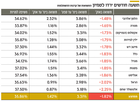 ואולם כל גופי הפנסיה הוכו באוקטובר, לאחר שמדד S&P500 האמריקאי איבד 6.87%, מדד נאסד"ק ירד ב־8.66% ומדד דאו ג'ונס איבד 5.07% מערכו. בישראל מדד ת"א־35 נחתך ב־3.39% ומדד ת"א־125 ירד ב־3.2%. אוקטובר היה למעשה חודש מבחן, שבו נבדקה איכות ניהול ההשקעות, אם כי אין פערים דרמטיים בין הגופים. הגוף שירד הכי פחות - הלמן־אלדובי - איבד 1.48% עם חשיפה נמוכה יחסית למניות (34.6%). הגוף שירד הכי הרבה - אלטשולר - איבד 2.25%, עם חשיפה גבוהה למניות, של 37.5%.