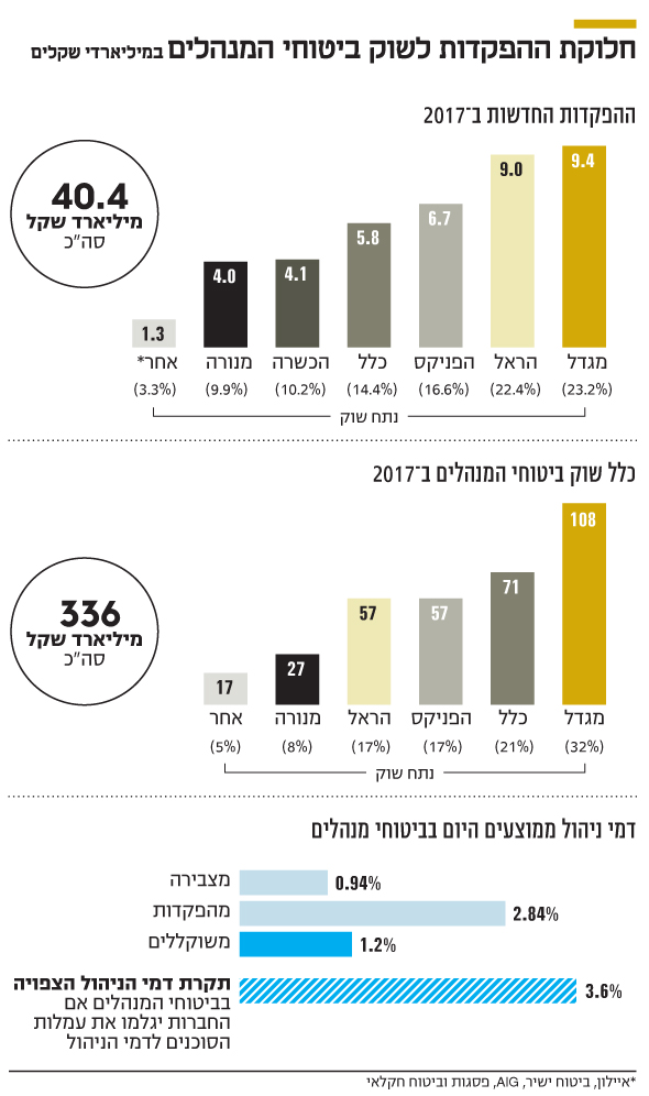 עם זאת, בשוק הביטוח מעריכים כי בעוד שמדי שנה מצטרפים כ־200 אלף חוסכים חדשים לקרנות פנסיה, לביטוחי המנהלים מצטרפים כ־100 אלף חוסכים חדשים שמפקידים פרמיה חודשית ממוצעת של 1,300 שקל או 16 אלף שקל בשנה – קרי מוסיפים לענף פרמיות חדשות בהיקף של 1.6 מיליארד שקל בשנה.
