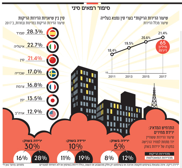 ”מחירי הדירות כל כך עלו בשנים האחרונות, עד שלמי שקונה דירות להשקעה ממש לא אכפת להשאיר אותן ריקות. בכל מקרה הערך שלהן זינק. היחס בין ערך הבית לתעריפי השכירות בסין הוא די נמוך, ושוק השכירות הסיני לא מפותח מספיק. אין הגנה לשני הצדדים, לבעלים ולשוכרים, כך שאנשים מפחדים להכניס מישהו לדירה שלהם. אנחנו רואים שככל שהבתים יותר יקרים, כך גדל הסיכוי שהם יישארו ריקים. זה נכון בעיקר לבתים בשווי של יותר מ־10 מיליון יואן (5.4 מיליון שקל), ששכר הדירה לא מצדיק להשכיר אותם. כמו כן, בערים גדולות בסין התחבורה לא טובה, ואם הבעל והאשה עובדים במקומות שונים בעיר, הם יגורו הרבה פעמים בשתי דירות במקביל. מבחינתנו, אחת הדירות האלו תמיד תיספר כריקה“.