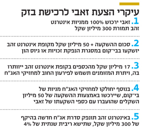 שוק ההון הריע אתמול (ב') להצעה שהגיש גד זאבי לרכישת בזק, באמצעות הזרמה לאינטרנט זהב ובי־קום, המחזיקות בה. מניית בזק קפצה אתמול בבורסת ת"א ב־10% והאג"ח של אינטרנט זהב זינק ב־42%. גם מניות בי־קום ואינטרנט זהב קפצו ב־15% וב־13% בהתאמה.- חברת שוהם ביזנס של אלי נידם גייסה לראשונה חוב בבורסה