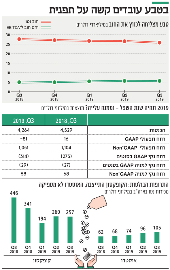 אחרי שנתיים של תירוצים לא מספקים, טבע מציגה דו"חות שרומזים כי 2019 תהיה שנת שפל, ואחריה התיקון: החוב נחתך ב־8.3 מיליארד דולר, הנפקת אג"ח תקל את עומס הפירעונות, גרסאות הביוסימילר תופסות תאוצה וההתייעלות טרם הסתיימה