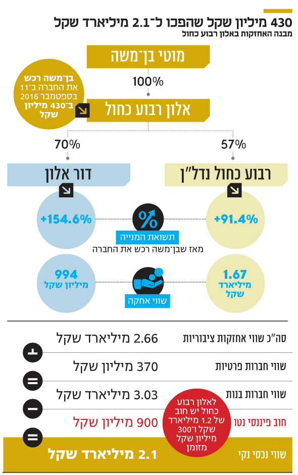 במקרה של אלון רבוע כחול, בן־משה נהנה עד כה מהמינוף הודות לעלייה החדה שנרשמה בשווי השוק של החברות הבנות, והודות להימנעות מחלוקת דיבידנד, הגם שכבר בסוף השנה שעברה יתרת הרווחים הניתנים לחלוקה של החברה עמדה על 225 מיליון שקל.