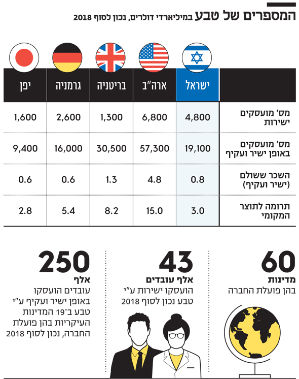 ב־19 המדינות שנבחנו העסיקה טבע באופן ישיר ועקיף 230 אלף עובדים ותרמה 50.7 מיליארד דולר לתוצר המצרפי שלהן. ב־41 המדינות שלא השתתפו במחקר - כאשר שתי מדינות עם נוכחות משמעותית של של טבע, הודו ומקסיקו, נותרו בחוץ - היא מוסיפה 10 מיליארד דולר לתוצר. סך תרומתה של טבע לתוצר העולמי ב־2018 הייתה 60.7 מיליארד דולר בחישוב זה. התרומה המשמעותית ביותר של טבע היא כמובן לכלכלה הישראלית. החברה היא עדיין אחד המעסיקים הגדולים במשק עם 4,800 עובדים שמועסקים ישירות ואשר על פי המודל במחקר מתורגמים לתעסוקה עקיפה של 19,100 עובדים. יש לציין כי את החלק הישראלי של המחקר ביצעה חברת רותם אסטרטגיה ולא החוקר האמריקאי.