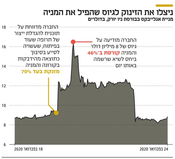 בינתיים המזומנים בקופתה של אנלייבקס אוזלים בהדרגה. בסוף ספטמבר האחרון היו בקופת החברה 13.5 מיליון דולר בלבד. בנובמבר היא ניסתה לבצע גיוס אך ביטלה אותו בשל ביקושים נמוכים. ואז הגיעה בהלת הקורונה.