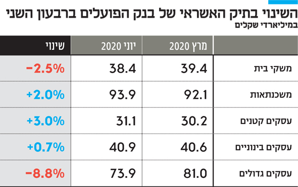 2. תיק האשראי של הפועלים צמח בשיעור מתון של 0.3% במחצית הראשונה של השנה ל־294 מיליארד שקל, אולם בתוך תחומי הפעילות של הבנק חלו מגמות שונות. האשראי הצרכני ירד בחדות ביותר מ־7% מתחילת השנה ל־38.4 מיליארד שקל, הן מכיוון שהסיכון עלה, והן מכיוון שבזמן הסגר מערך מכירות האשראי של הבנק לא עבד.