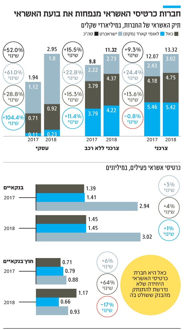לעומתה, ישראכרט הגדילה את כרטיסי האשראי החוץ־בנקאיים שלה רק ב־3.2% ב־2018, אולם הגדילה את ההלוואות הצרכניות בנטרול רכב ב־22.8%. גם בלאומי קארד התופעה הזו מובהקת: מספר הכרטיסים החוץ־בנקאיים שלה דווקא ירד ב־2018 ב־8.4%, בגלל אובדן מועדון שופרסל, אולם היא הגדילה ב־11.4% את האשראי הצרכני בנטרול רכב.