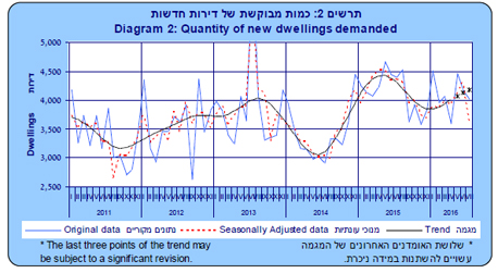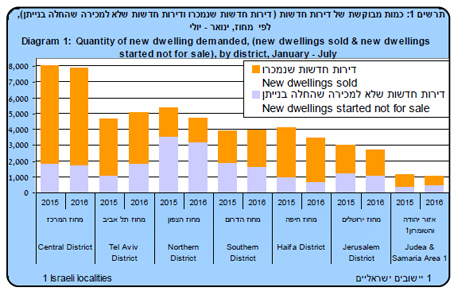 בסוף יולי נותרו למכירה כ-28,070 דירות חדשות, בדומה לחודש יוני. על פי נתוני מגמה נרשמה עלייה של כ-0.6% בממוצע לעומת חודש יולי 2015 - שיא של 15 שנה. כ-29% מתוכן מוצעות למכירה במחוז מרכז, כ-16% במחוז חיפה, כ-15% במחוז דרום וכ-12% בכל אחד מהמחוזות תל אביב, ירושלים והצפון.