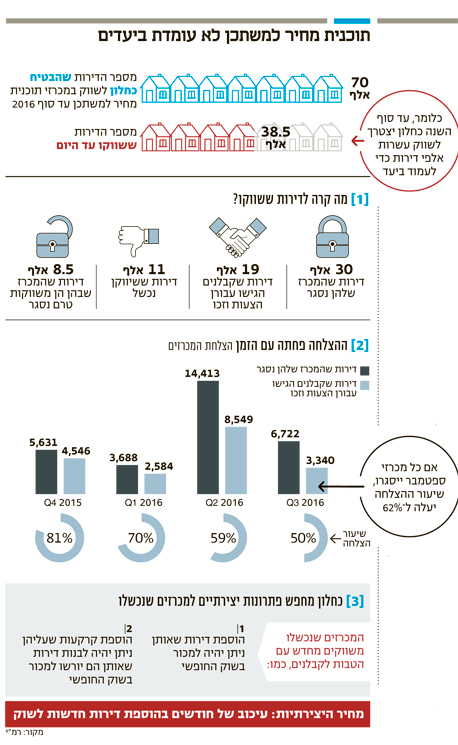 כחלון הבטיח לשווק באמצעות התוכנית 70 אלף דירות עד סוף 2016. כלומר, הוא הבטיח שיפרסם מכרזים לשיווק קרקעות לקבלנים שעליהן ניתן יהיה לבנות את מספר הדירות הזה.