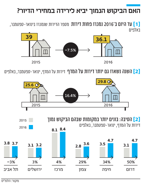 כך, למשל, במחוז הדרום נרשמה עלייה של 50% במספר הדירות שנמצאות על המדף בינואר־ספטמבר 2016 בהשוואה לתקופה המקבילה אשתקד, במחוז חיפה נרשמה עלייה של 35% ובצפון העלייה עמדה על כ־30%. זאת בזמן שבמחוז ירושלים נרשמה עלייה של 4%, במחוז מרכז נרשמה עלייה של 3% ובתל אביב נרשמה ירידה של 3%.