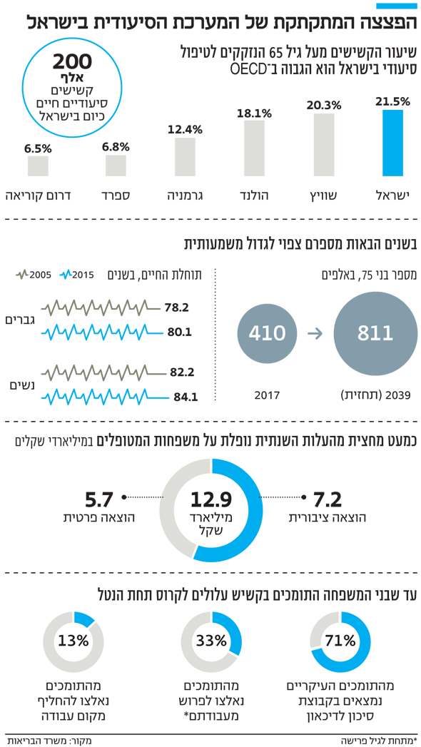ממדיה של הבעיה הסיעודית בישראל הולכים ותופחים. שיעור הקשישים הסיעודיים מעל גיל 65 בישראל הוא הגבוה במדינות ה־OECD, ומספרם עומד על כ־200 אלף. ברחבי המדינה פרוסות כיום 21 אלף מיטות גריאטריות בכ־800 מחלקות ובכ־300 מוסדות סיעודיים. באוכלוסייה הזו מטפלים כ־8,800 עובדי סיעוד שמשתכרים שכר מינימום וקורסים תחת העומס. ההוצאה הלאומית על טיפול בקשישים סיעודיים עומדת על 12.9 מיליארד שקל בשנה, כאשר 44% מהסכום הזה יוצאים ישירות מכיסי משפחות המטופלים.