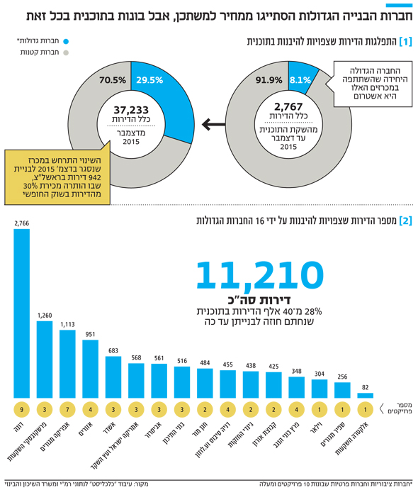 המגמה הזו התחזקה מאז. הנתון שאולי מעיד על כך יותר מכל הוא שבמכרז האחרון שנסגר לפני שבועיים, בראשון לציון גם כן, החברות הגדולות זכו ב־1,309 דירות מתוך 2,500 שהוצעו לקבלנים - יותר מ־50% מהדירות במכרז.