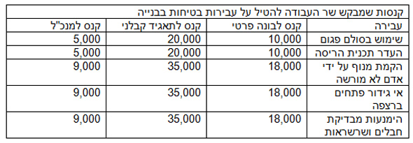נוסח הצו קובע שתי דרגות של קנסות. עיצומים כספיים של עד 20 אלף שקל יוטלו על עבירות של שימוש בסולם פגום, הימנעות מניהול פנקס עגורן (מנוף גדול), היעדר תכנית עבודה מפורטת לעבודות הריסה, ביצוע פעולות חפירה ללא בדיקה של המצאות תשתיות במקום ועוד. במקרה והעבריין הוא אדם פרטי (שמעסיק פועלים להקמת ביתו) ולא קבלן מקצועי, יעמוד הקנס על עבירות אלה על חצי מהקנס המקסימלי, כלומר עשרת אלפים שקלים.