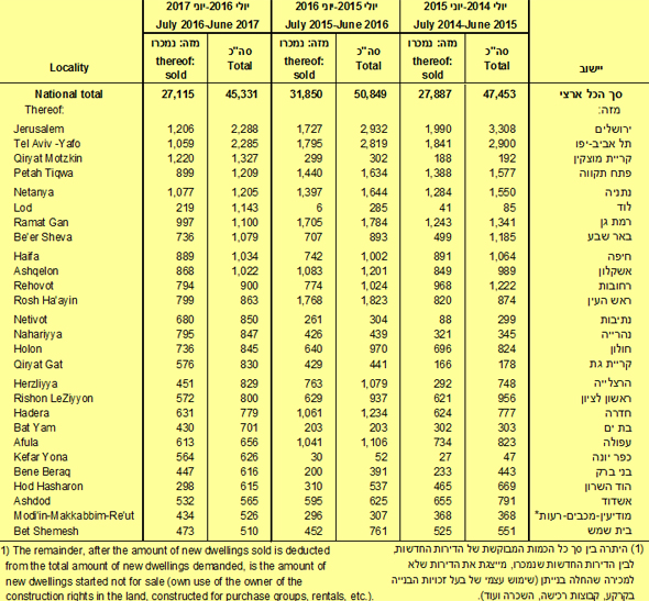 עוד הסבירו בלמ"ס כי השינויים על פני זמן, ביישובים השונים, אינם אחידים. כך למשל ירושלים ותל אביב-יפו הובילו את טבלת הביקוש דירות חדשות בתקופת הסקירה (יולי 2016 עד יוני 2017) עם 2,288 דירות חדשות בירושלים ו-2,285 דירות חדשות בתל אביב, אך בהשוואה לשנה הקודמת (יולי 2015 עד יוני 2016) מדובר בירידה של 22% ושל 19%, בהתאמה.
