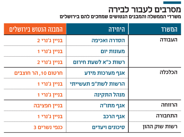 לתשע יחידות המשויכות למשרדי העבודה, הכלכלה, הרווחה, רשות שוק ההון והתחבורה יש כיום משרדים מוכנים בירושלים בבעלות הממשלה, ולמרות זאת הם ממשיכים לשכור משרדים מחוץ לבירה, מרביתם בתל אביב. בינתיים הציבור משלם על שכירות מיותרת בת”א ועל ארנונה בשתי הערים. ב־2019 הגישה תנועת “התעוררות” הירושלמית עתירה, וכעת היא מבקשת לעדכנה לאור נתוני התשלומים.