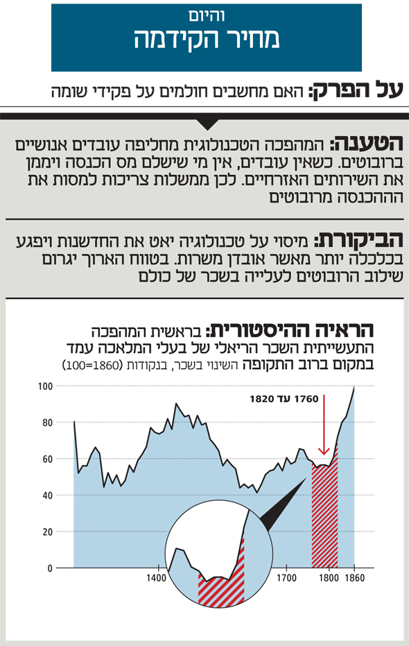 זה גם מה שמראים החישובים של ההיסטוריון הכלכלי גרגורי קלארק מאוניברסיטת דייוויס בקליפורניה. לפי הנתונים שאסף, בתחילת המהפיכה התעשייתית השכר הריאלי של בעלי מלאכה בענף הבניין, למשל, עמד במקום ואפילו ירד במשך 60 שנה, בין 1760 ל־1820. 60 שנה עברו לפני ששכר העובדים האלה החל לעלות. הטכנולוגיה אולי מגדילה את העוגה עבור כולם, אבל העוגה תופחת לאט.