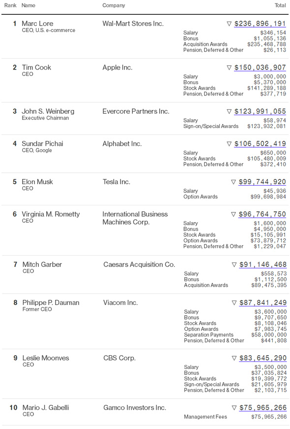במקום ראשון נמצא מארק לו (מייסד Jet.com), מנכ"ל יחידת המסחר האלקטרוני בוולמארט, עם שכר של 236.9 מיליון דולר - זאת הודות לרכישת החברה שלו בידי וולמארט. במקום שני טים קוק מנכ"ל אפל עם 150 מיליון דולר. במקום השלישי נמצא ג'ון ס. וינברג עם 124 מיליון דולר.
