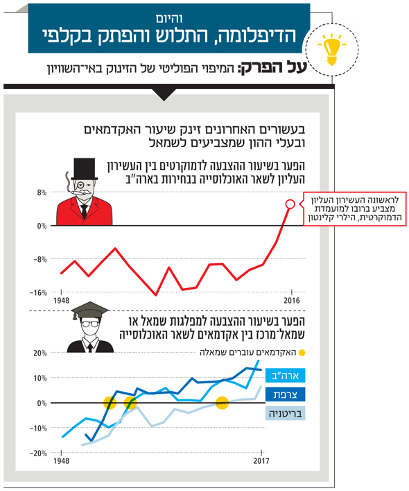 כך, בצרפת של 1956, ככל שהיית משכיל יותר, כך היה סיכוי גבוה שתצביע לימין. רק 37% מבעלי ההשכלה הגבוהה הצביעו לשמאל. ב־2017 המצב היה הפוך: יותר מ־60% מהאקדמאים הצביעו לשמאל. בבריטניה, וגם בארה"ב, המגמה דומה. בבחירות האחרונות לנשיאות, למשל, 75% מבעלי תואר דוקטור הצביעו להילארי קלינטון, המועמדת הדמוקרטית. דונלד טראמפ, מצדו, הכריז בקמפיין הנשיאות: "אני אוהב את חסרי ההשכלה".