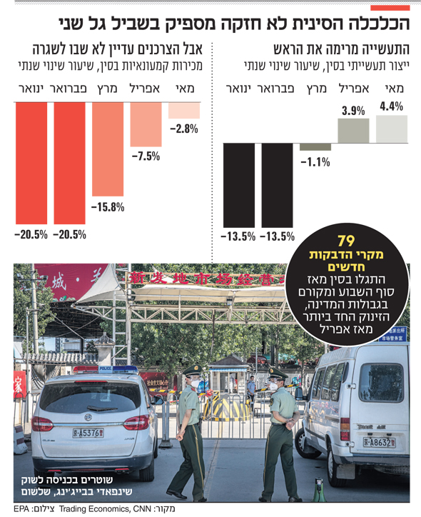 החשש מהתפרצות גל שני של המגפה מגיע על רקע התאוששות זהירה במגזר התעשייתי וקושי רב לחזור לשגרה בפעילות הצרכנית. אתמול דיווחה סין כי התוצרת התעשייתית, המשקללת את פעילויות הייצור, הכרייה והשירותים הציבוריים, צמחה ב־4.4% בחודש מאי לעומת החודש המקביל אשתקד. מדובר בצמיחה חזקה יותר מ־3.9% שנרשמו באפריל, אך פחות משיעור של 5% שלו ציפו אנליסטים בסוכנות בלומברג.