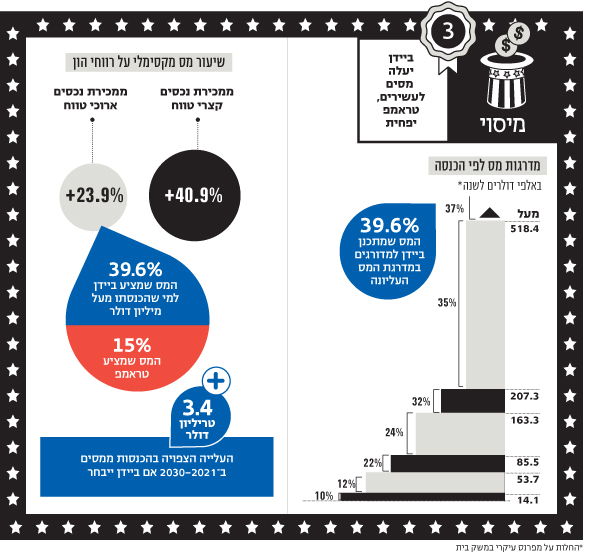 המועמד הדמוקרטי מציע לשנות את קוד המס ובכך לבטל את חקיקת טראמפ מ־2017. הצעתו כוללת העלאת המס הפדרלי על בעלי הכנסה גבוהה מ־400 אלף דולר בשנה מ־37% בחזרה ל־39.6%, ובמקביל הענקת הקלות מס לפנסיה של בעלי הכנסה נמוכה. הוא מציע גם להעלות את מס החברות ולקנוס חברות שמעבירות משרות מעבר לים, כדי למכור מוצרים בחזרה לארה"ב. לפי הערכות, השינוי יוסיף 2.8 טריליון דולר לקופת המדינה לאורך עשור. סכום זה יאפשר, לדבריו, להאיץ צמיחה באמצעות השקעה פדרלית בתשתיות ואנרגיה ירוקה.